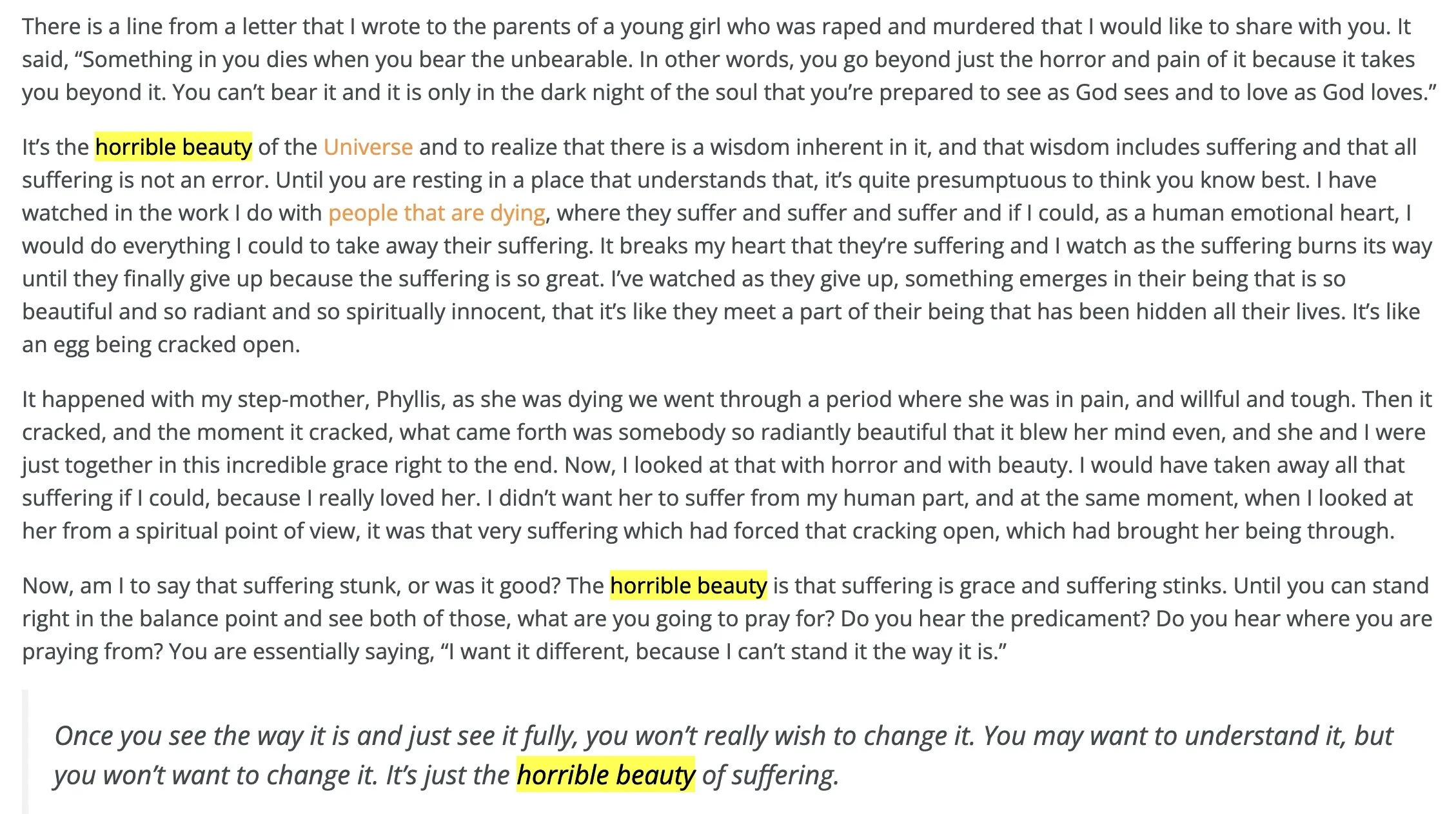 Even understanding the role of Karma, one still has to feel all of the feelings and experience the Karma firsthand… not to mention, the physical pain itself. There’s no escaping that; there’s only surrendering to it. And through that ultimate surrender comes a gentle peace that steadies one’s spirit and ultimately evaporates the suffering as a whole. Fighting against the pain only strengthens and validates its existence… accepting it disempowers it because there is no longer any illusion of separation. Your energy is no longer feeding the illusion of suffering. There’s another paradox: the way to win the battle is to surrender.