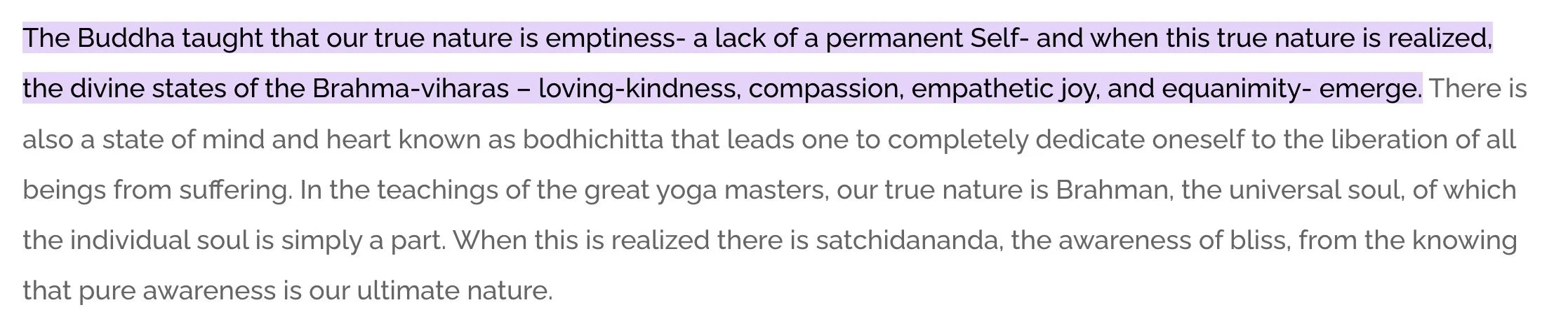 Meditation teaches us to compassionately witness these patterns of the monkey mind with a detached loving awareness. Through consistent practice, one begins to clearly see the true nature of life: impermanence, non-self, interdependence, and dependent origination, which frees them from the illusions the human mind has created: identity / “self,” separation (duality), permanence, suffering, etc.