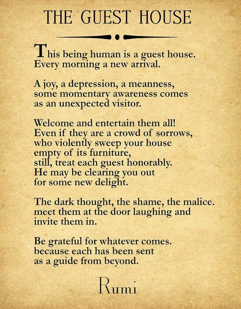 Today, I am choosing to embrace the tiredness, fatigue, brain fog, and delirium… the imperfection. My body is a guesthouse, and right now, these simply happen to be my guests … so I will be a good host and show them kindness. Who knows -they may be doing me a favor by clearing out space so that joy and bliss can visit me tomorrow. All I know is that my body holds the holy blueprint, and it knows how to heal itself. I just have to allow it to. Today, I choose to flow with it all.