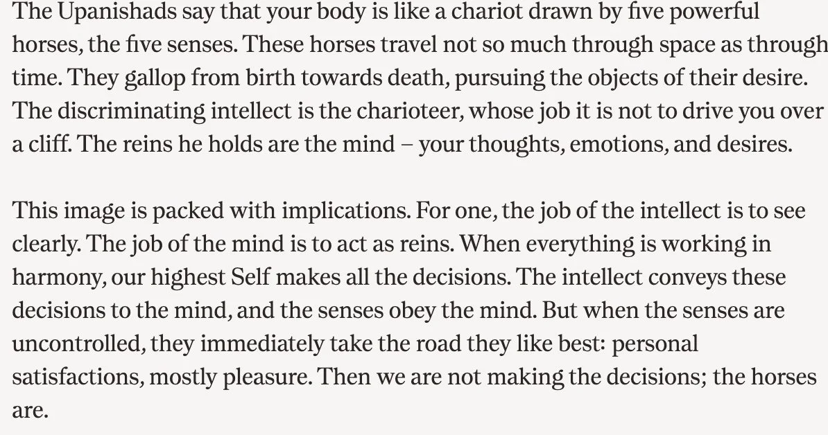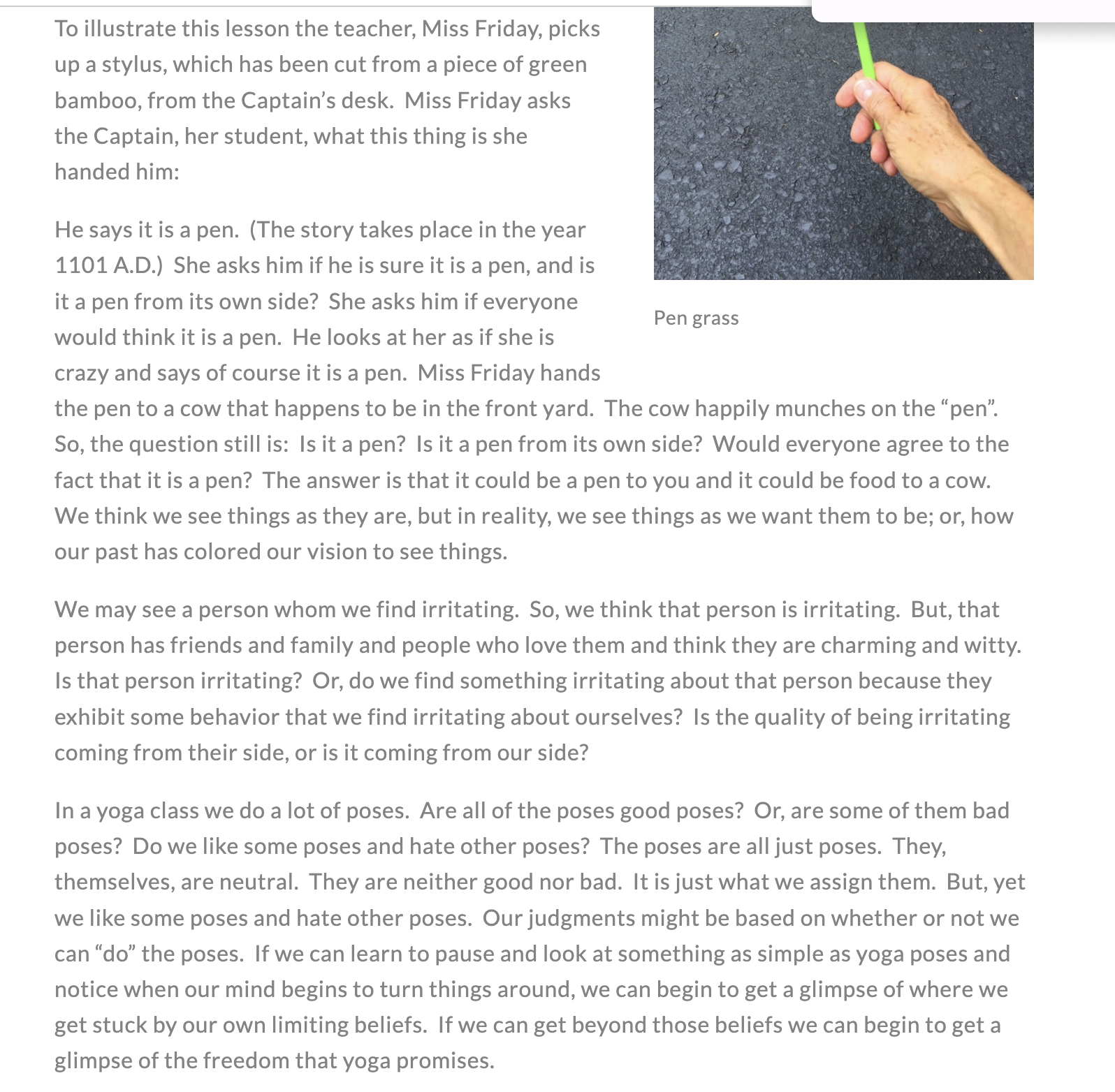 “The Yoga Sutras ask us to practice seeing the emptiness of all things. To see, in the words of William Shakespeare, that ‘… there is nothing either good or bad, but thinking makes it so.’ To learn to see things as neutral and to watch as our mind judges and assigns value to things.”